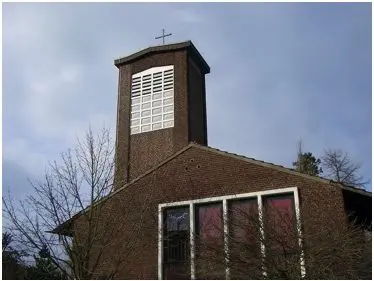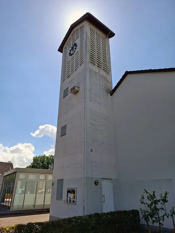 Grundstück von Dr. Dietrich Girmes, Grundsteinlegung 1957, 1958 gebaut, Architekt Karl Sander (Bedburg), Gemeindezentrum 1996, Architekt Karlhans Pleiderer (Neuss), 4 Glocken