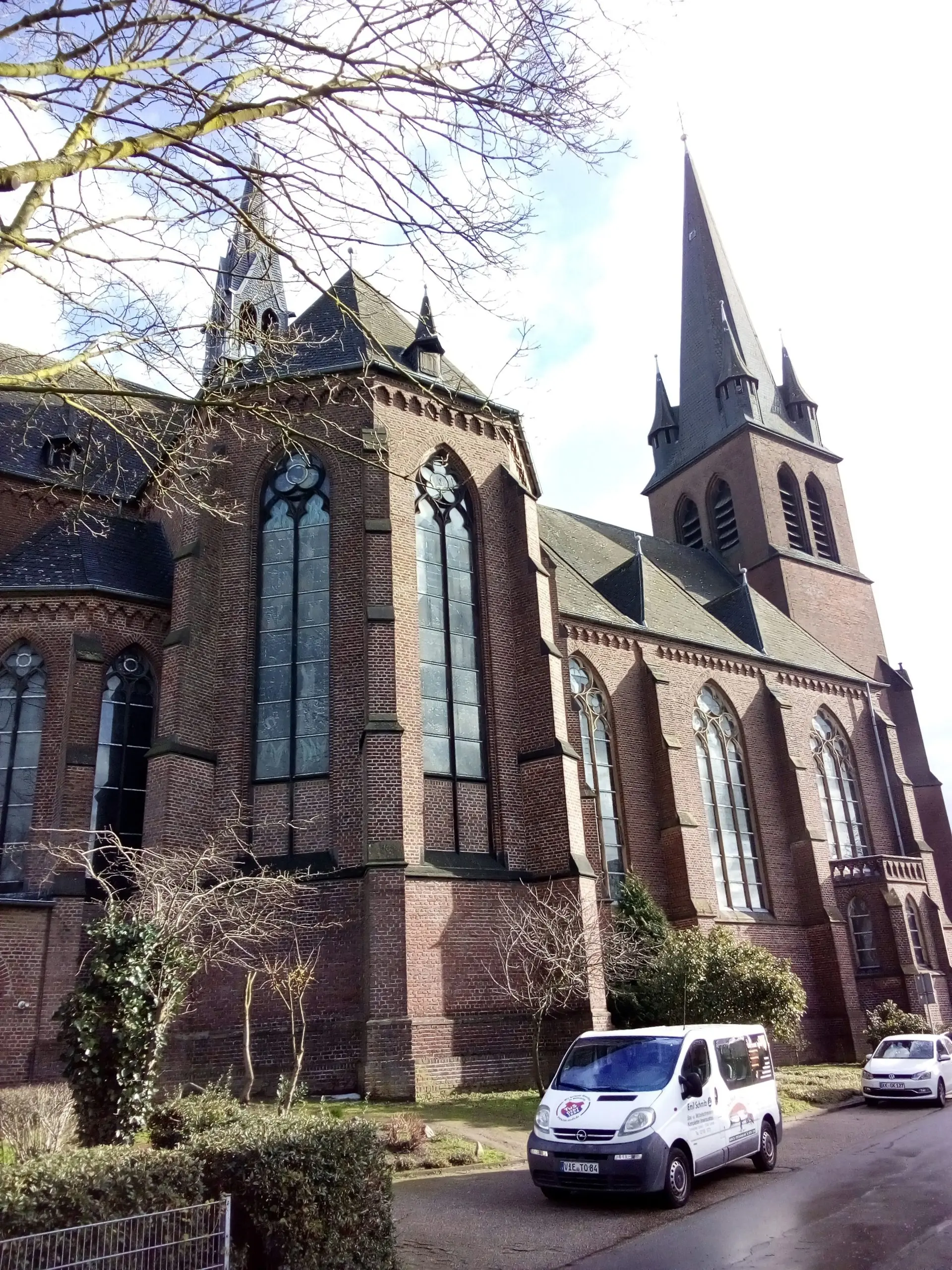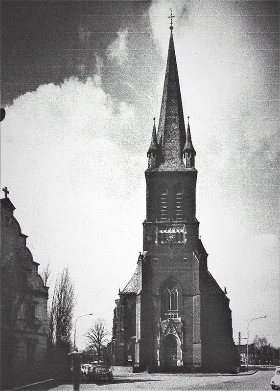Grundsteinlegung und Einweihung 1900, Architekt Richard Odenthal Köln, Bauunternehmen P. H. Schmitz Grefrath, Baustil der Kirche ohne Turm neugotisch, Baukostenschätzung 70.000 Mark, gesammelt wurden 100.000 Mark, Kirchturmbau 1953, Höhe 32 m incl. Hahn, Turmbaukosten 66.000 DM, Rektoratskirche 1900-1953, Pfarrkirche 1953-2012, 8 Rektoren und 6 Pfarrer, 6 Glocken im Kirchturm